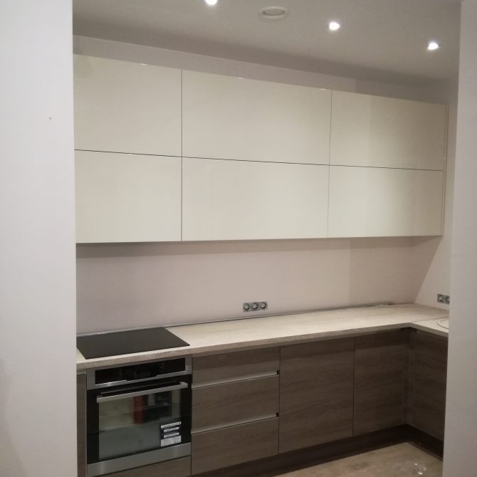 Panaudoti viršutinių spintelių durelių pakėlimo mechanizmai "Blum". Viršutinių spintelių fasadai nuleisti 2cm žemiau korpuso - lengvesniam ir patogesniam atidarymui.